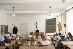 Eine historische Unterrichtsstunde, in der noch Disziplin und Ordnung herrschen. Kopfrechnen, Schönschreiben und Singen stehen hier auf dem Stundenplan.